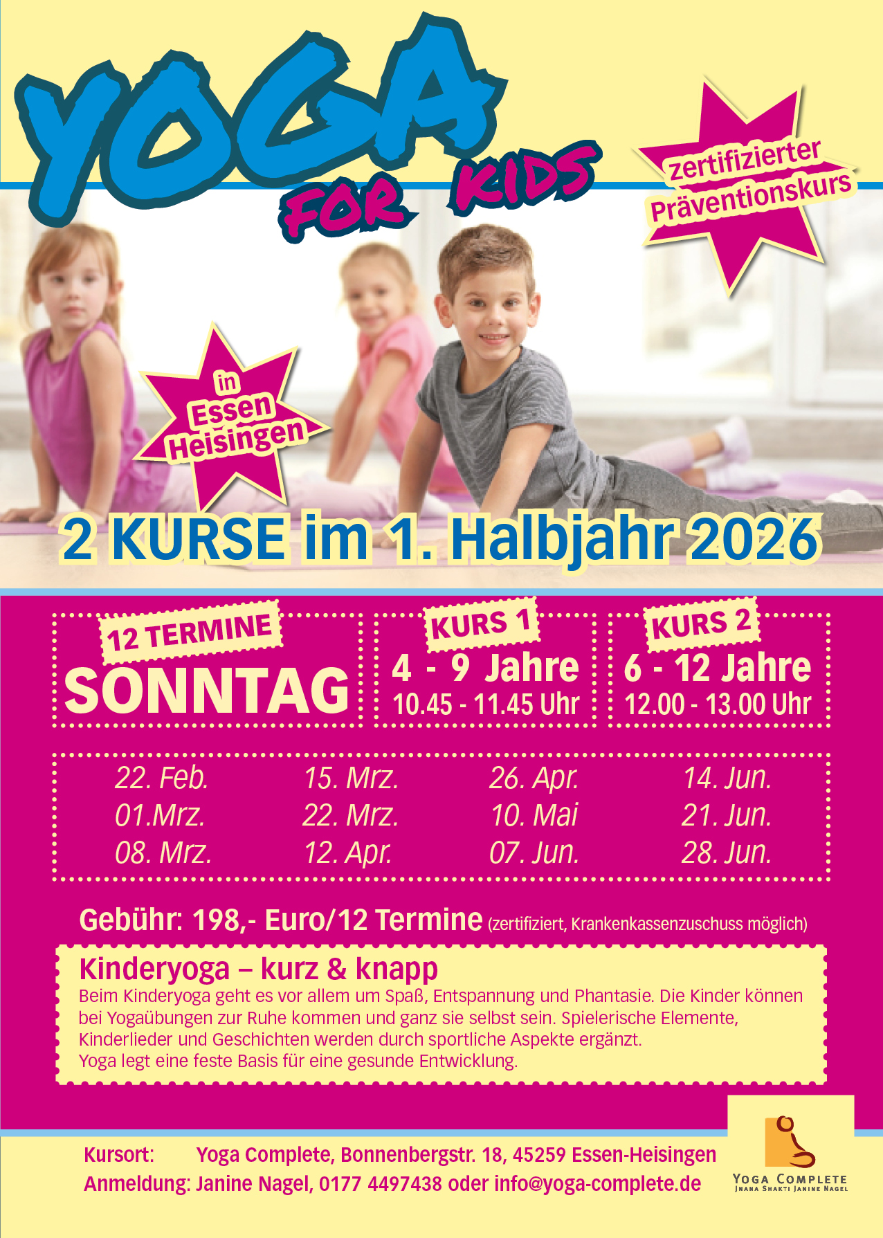Beim Kinderyoga geht es vor allem um Spaß, Entspannung und Fantasie. Die Kinder können bei Yogaübungen zur Ruhe kommen und ganz Sie selbst sein. Spielerische Elemente, Kinderlieder und Geschichten werden durch sportliche Aspekte ergänzt. Yoga legt eine feste Basis für eine gesunde Entwicklung.
